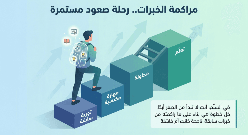 لذا عندما تقول لنفسك سأبدأ من الصفر، فأنت في الحقيقة لا تفعل ذلك، بل أنت تبدأ بما راكمته من خبرات في الدرجات التي صعدتها، وهذا يعني أن لديك ما تبني عليه في المحطة التالية، ونحاول تذكيرك بهذا الأمر دائمًا.