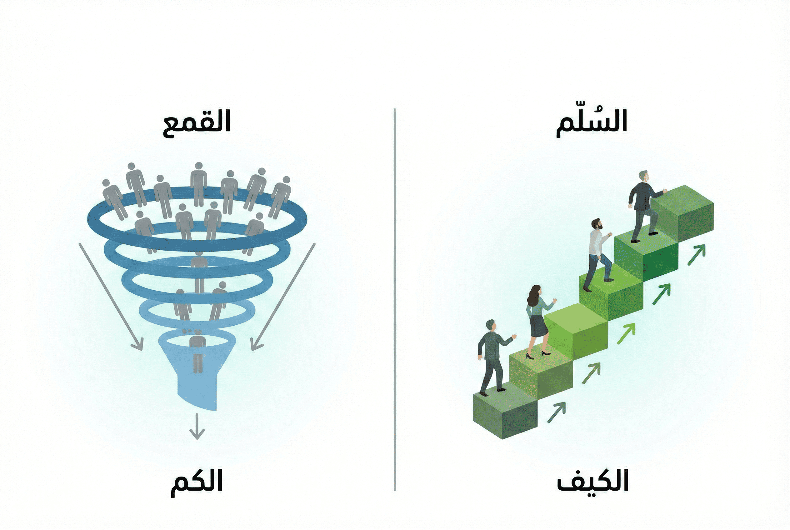وهذا يعني أن العميل لا ينزلق سريعًا من مرحلة لأخرى كما في القمع، لكنه هو من يقرر اتّخاذ الخطوة التالية. صحيح يهتم بالعروض والخصومات وكل ما يمكنه تحفيزه، لكن هذا ليس محرك القرار، إنما الجاهزية الحقيقية لاتّخاذ الخطوة.